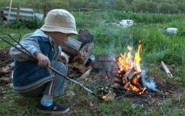 Открытый огонь привлекает всех деток без исключения. Им очень хочется познать эту стихию, а взрослые боятся, что это знакомство состоится. Вам не удастся убедить малыша, что огонь – это не интересно. Даже если вы будете запрещать ребёнку приближаться к нему, малыш всё равно познакомится с огнём, но уже без вас. Поэтому и вам, и ребёнку будет спокойнее, если вы научите его правилам безопасности и способам тушения огня. Договоритесь с малышом, что подходить к огню он будет только в вашем присутствии. Объясните, что главная опасность костра заключается в том, что пламя может запросто перекинуться от костра на сухую траву и дачный домик. Можете показать в безопасной обстановке, как моментально вспыхивает и сгорает, например, лист бумаги. У всех людей, в том числе и маленьких, есть природный страх перед огнём. Но у людей, в отличие от животных, есть власть над ним. Обязательно держите рядом с костром ведро воды, а в доме – огнетушитель.