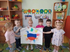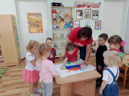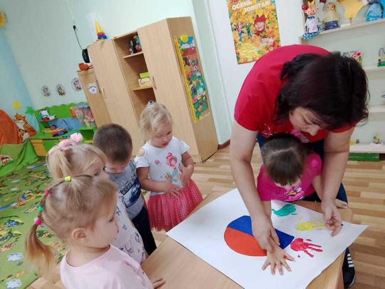 В преддверии Дня народного единства в младшей группе «Сказка» прошло увлекательное занятие по нетрадиционному рисованию ладошкой! Ребята с радостью по очереди оставляли свои яркие отпечатки на ватмане, создавая красивое и красочное изображение, которое символизирует единство и дружбу всех народов.